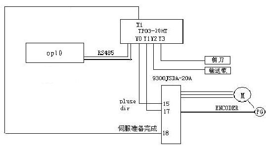 切紙機(jī)械是印刷和包裝行業(yè)常用的設(shè)備之一。切紙機(jī)完成的基本動作是把待裁切的材料送到指定位置,然后進(jìn)行裁切。其控制的核心是一個(gè)單軸定位控制。目前國內(nèi)進(jìn)行切紙?jiān)O(shè)備進(jìn)給定位系統(tǒng)主要有兩種方式,一是利用PLC結(jié)合變頻器實(shí)現(xiàn),一是利用PLC結(jié)合伺服系統(tǒng)實(shí)現(xiàn),從效率上來說伺服相對變頻器要高很多。這次我們結(jié)合客戶設(shè)備的特點(diǎn)提出了一套方案,文本(OP10)+PLC(TP03-20HT)+伺服(JSDE-20A)進(jìn)行裁切參數(shù)設(shè)定和完成一些手動動作。
