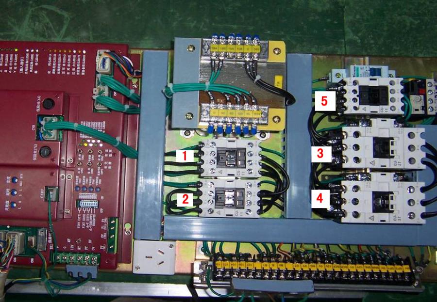 上圖中,1#、2#接觸器主要用于控制電機(jī)星-三角啟動(dòng),3#接觸器主要用于控制電機(jī)正轉(zhuǎn)起動(dòng)(即織機(jī)正常起動(dòng)),4#接觸器主要用于控制電機(jī)反轉(zhuǎn)點(diǎn)動(dòng)(即織起正常起動(dòng)前絲線位置的調(diào)整),5#接觸器+熱繼電器主要用于控制風(fēng)機(jī)。